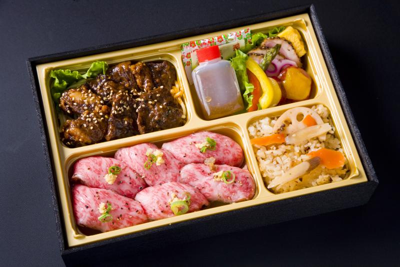 A4クラス以上を使用した黒毛和牛の霜降り肉寿司6貫盛合せと、和牛ロースカルビ焼肉を組合せた豪華逸品弁当です。